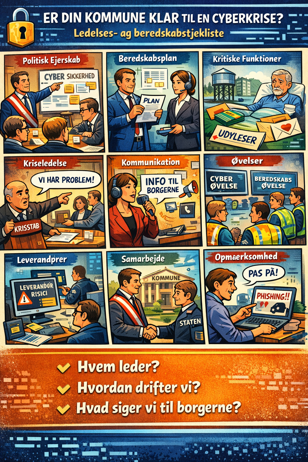 En ledelses- og beredskabstjekliste for kommuner Denne tjekliste er ikke teknisk.Den er lavet til borgmestre, kommunalbestyrelser, kommunaldirektører og direktioner. Cyber er i dag en ledelseskrise